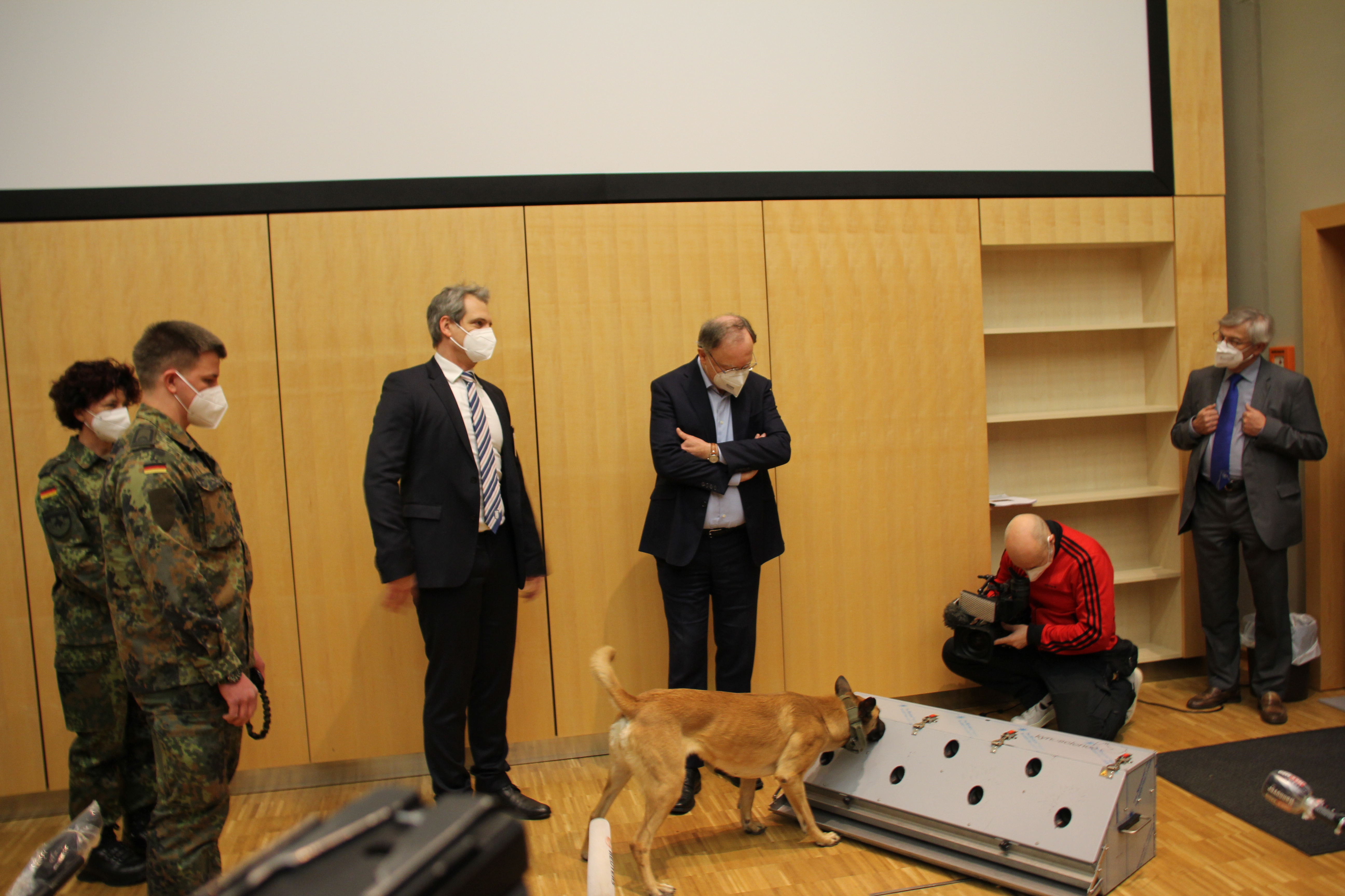 Bereits im Sommer vergangenen Jahres zeigten Forschende aus der Klinik für Kleintiere der Stiftung Tierärztliche Hochschule Hannover in einer Studie veröffentlicht, dass trainierte Spürhunde in der Lage sind, Speichelproben SARS-CoV-2-infizierter Menschen von Speichelproben gesunder Menschen zu unterscheiden. Ihre mittlere Detektionsrate lag bei 94 Prozent. Ministerpräsident Weil bei seinem Besuch am 3. Februar 2021 über die Forschungsergebnisse informiert.