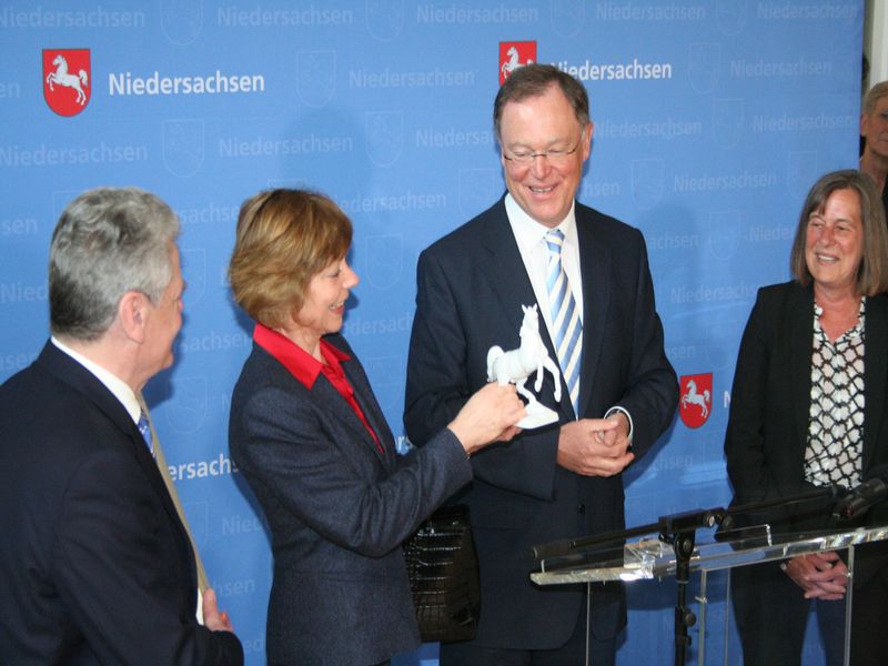 Gastgeschenk: Daniela Schadt, Lebensgefährtin von Bundespräsident Joachim Gauck, erhält von Ministerpräsident Stephan Weil ein Niedersachsen-Ross aus Fürstenberg-Porzellan.