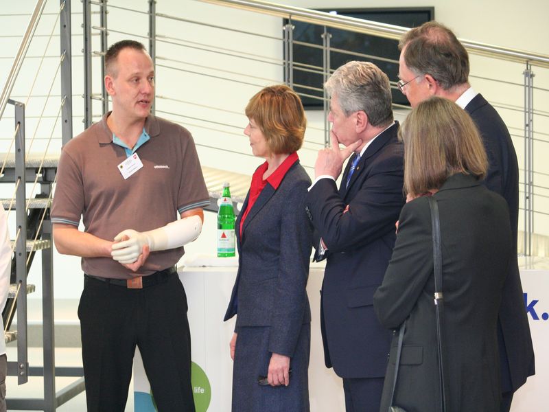 Bundespräsident Joachim Gauck, seine Lebensgefährtin Daniela Schadt, Ministerpräsident Stephan Weil und Rosemarie Kerkow-Weil lassen sich eine Hightech-Armprothese der Firma Ottobock zeigen.