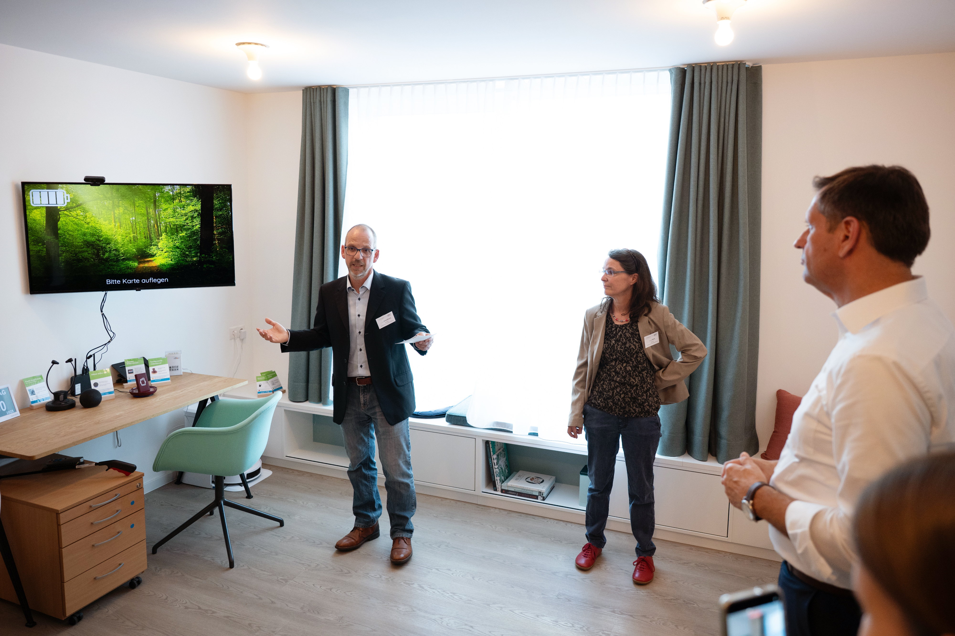 Zum Abschluss der Sommerreise stand ein Besuch in einer Musterwohnung für technikunterstütztes Wohnen im Alter auf dem Programm – ein Projekt der Stadt Osnabrück, das über 40 technische Hilfsmittel vorstellt. Ob Lichtsteuerung per Sprache, Notfallsysteme, Sensorik oder Alltagshilfen: Ziel ist es, älteren Menschen und Menschen mit Einschränkungen ein möglichst langes, selbstbestimmtes Leben in den eigenen vier Wänden zu ermöglichen. Ministerpräsident Olaf Lies probierte vor Ort selbst einige der digitalen Alltagshelfer aus und zeigte sich beeindruckt von der Vielfalt und Praxistauglichkeit der vorgestellten Lösungen. Er betonte, wie wertvoll solche Projekte für die Lebensqualität und Teilhabe in einer älter werdenden Gesellschaft sind. Die Musterwohnung verdeutlichte eindrucksvoll, wie Digitalisierung ganz konkret und inklusiv zum Wohl der Menschen eingesetzt werden kann.