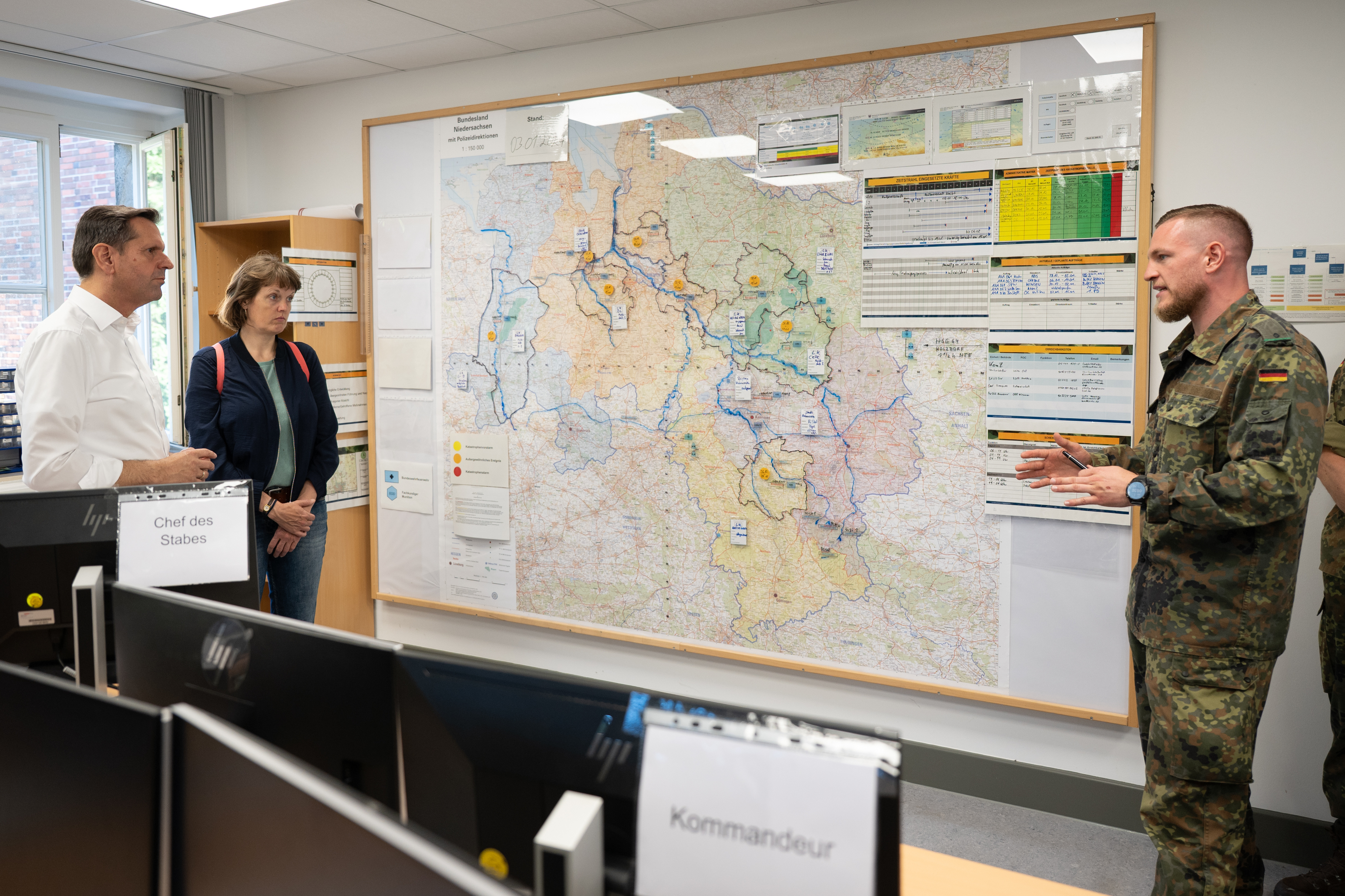 Besonders beeindruckt zeigte sich der Ministerpräsident von der Rolle des Landeskommandos als „Sensor in der Fläche“, das wichtige Lagebilder für den Bevölkerungsschutz liefert. Die Einblicke in das Lagezentrum und die Gespräche mit den Soldatinnen und Soldaten zeigten anschaulich, wie entscheidend vertrauensvolle Zusammenarbeit und gewachsene Netzwerke für eine rasche und koordinierte Unterstützung in Krisensituationen sind. Insgesamt wurde deutlich, dass die enge Verzahnung von zivilen und militärischen Strukturen eine zentrale Grundlage für die Sicherheit und Widerstandsfähigkeit Niedersachsens bildet.