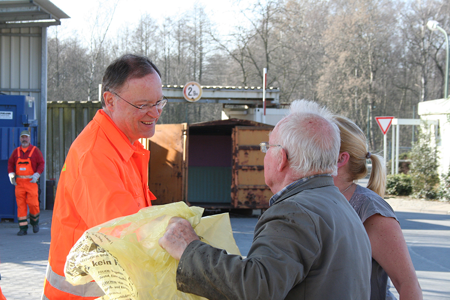 Im Abfallwirtschaftszenrum Piesberg hat Ministerpräsident Weil einen Einblick über die anfallenden Arbeiten bei der Anlieferung von Abfällen gewinnen können. Dabei standen Arbeiten wie das Sortieren von Stoffen nach unterschiedlichen Fraktionen, Beladen eines Containers mit Kühlschränken bis hin zum Sieben von Kompost per Radlader auf dem Programm.
