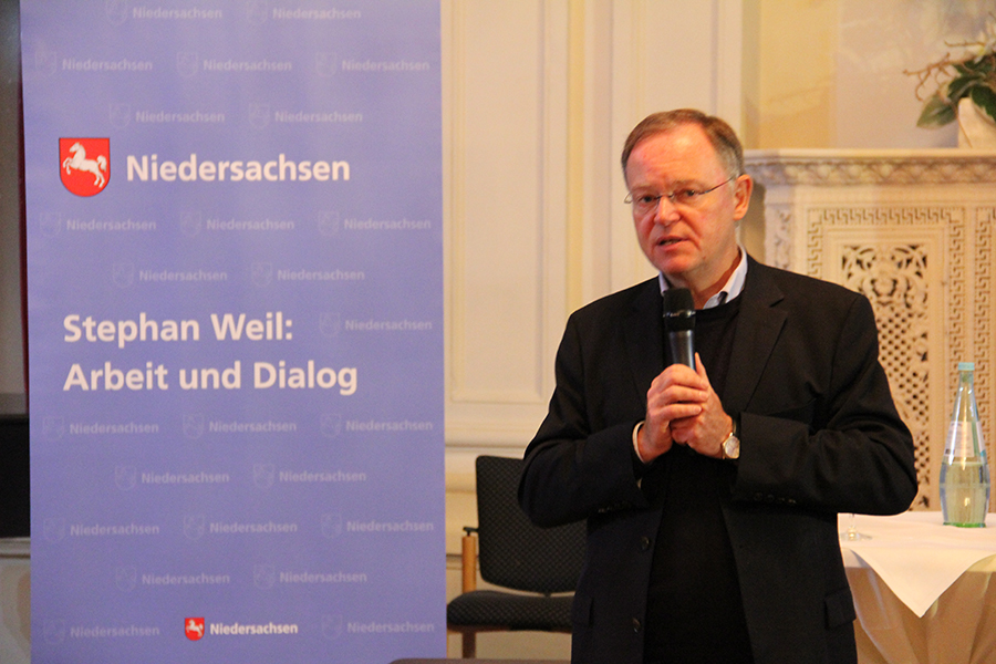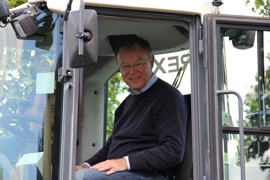 Im Rahmen der Veranstaltungsreihe "Stephan Weil: Arbeit und Dialog" hat Ministerpräsident Weil einen Nachmittag in einer Baumschule in Bad Zwischenahn mitgearbeitet. Nach einer allgemeinen Einweisung standen zunächst gärtnerische Arbeiten mit und an der Pflanze auf dem Plan. Im Anschluss daran grub der Ministerpräident mit einem speziellen Minibagger einen großen Buxus mit Ballen aus. Der Wurzelballen wurde dann mit einem Schutzvlies ummantelt, bevor der Ballen mit Hand und speziellen Akkuschraubern fest verdrahtet wurde. Die so versandfertig vorbereitete Pflanze lud Weil schließlich mit viel Fingerspitzengefühl mittels Radlader mit Gabel auf einen bereitstehenden Schlepperanhänger zum Abtransport.