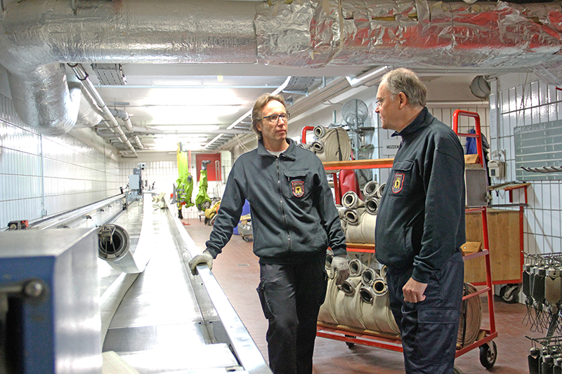 In der Atemschutzwerkstatt wurden dem Ministerpräsidenten zunächst die Besonderheiten der verschiedenen Druckluftfalschen erklärt und gezeigt, wie diese gewartet und eingesetzt werden. Diese sind inzwischen zu einem der wichtigsten Geräte der Feuerwehrleute geworden, da kein Einsatz mehr ohne Atemschutzgerät durchgeführt wird. Beeindruckt zeigte sich Weil von der anstrengenden Arbeit der Feuerwehrleute: „Teilweise müssen die Feuerwehrleute dann zwei von diesen 20 Kilogramm schweren Flaschen mit sich tragen. Das heißt sie haben dann einen extremen Einsatz“. Im Anschluss lernte der Ministerpräsident, wie die Löschschläuche gewaschen, gereinigt und anschließend wieder aufgerollt werden, was zur festen Routine nach jedem Feuerwehreinsatz gehört.
