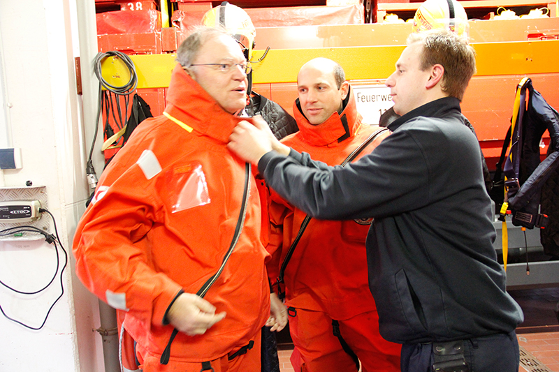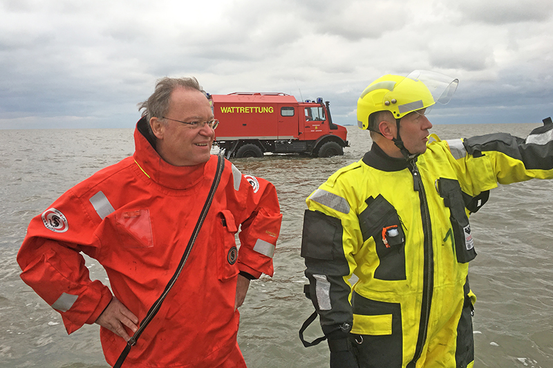 Zu den Sonderaufgaben der Cuxhavener Feuerwehr gehört die Watt- und Wasserrettung. Eine Testfahrt durch das Watt bildete den Abschluss des Arbeitseinsatzes von Stephan Weil. Vom Wind und auch dem relativ niedrigem Wasserstand ließen sich weder die Berufsfeuerwehr Cuxhaven und die Freiwillige Feuerwehr noch ihr Tages-Praktikant Weil abschrecken. Und so ging es – ausgestattet mit einem Überlebensanzug – erst mit dem Unimog und dann mit dem Boot ins Watt. Außerdem wurde hierbei auch der Rettungsstation Duhnen besichtigt. Zurück bei der Feuerwehrwache konnte sich die gesamte Truppe gemeinsam mit dem Ministerpräsidenten mit frisch Gegrilltem stärken und sich über die Arbeit der Feuerwehr austauschen.