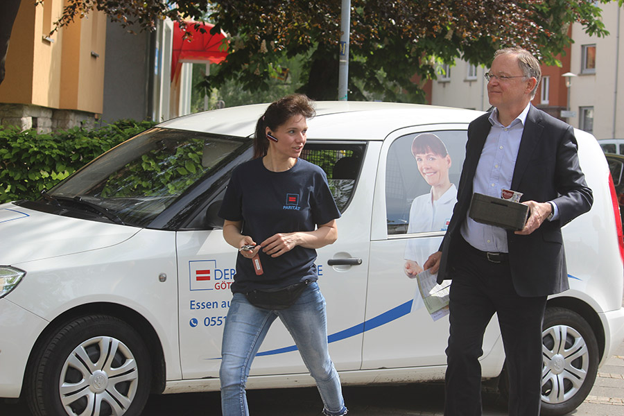 Am Mittwoch, 11. Mai 2016, hat Ministerpräsident Weil in Göttingen beim Paritätischen Wohlfahrtsverband "Essen auf Rädern" ausgeliefert. Für ein paar Stunden lieferte er auf einer Stadttour in Göttingen Mittagessen aus und kam dabei mit Kundinnen und Kunden ins Gespräch.