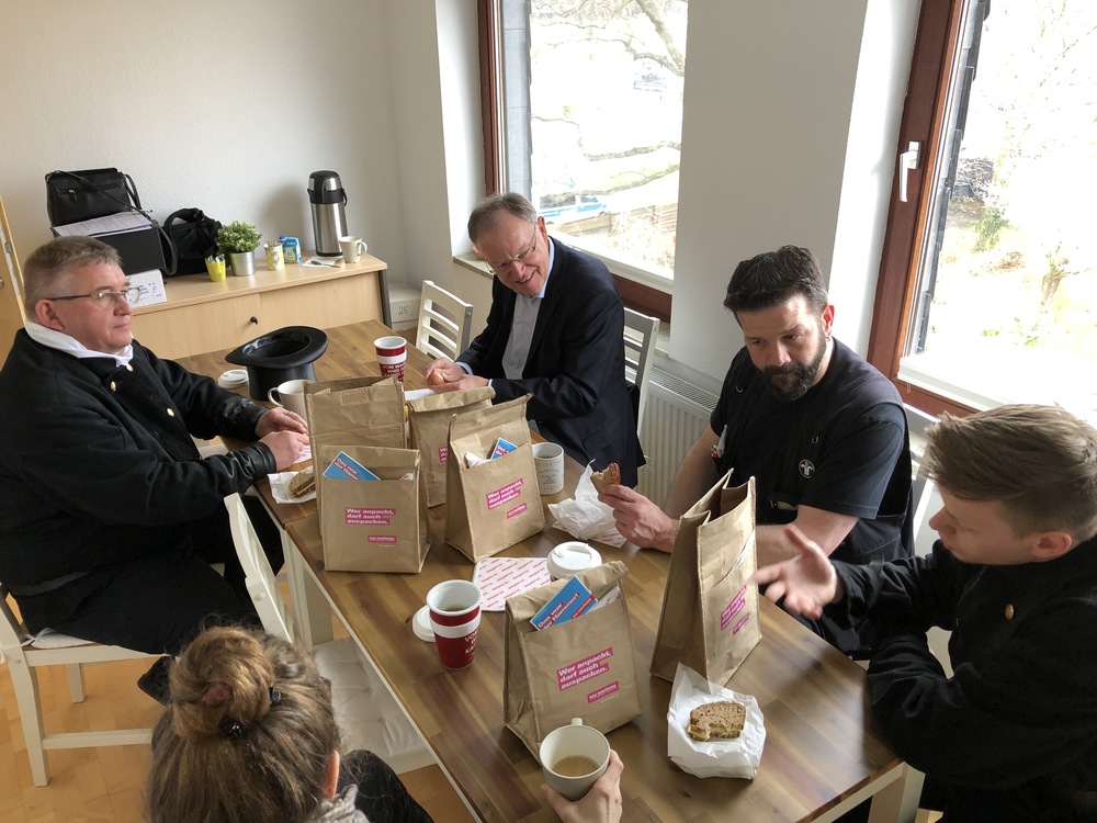 Davor nahm sich Stephan Weil ausführlich Zeit, um im Gespräch viel über den Beruf zu erfahren. „Schwindelfrei sollte man schon sein“, wie Lars Müller, Auszubildender im zweiten Lehrjahr, betonte. Der Beruf hat ein gutes Image und bietet hervorragende Zukunftschancen. In Niedersachsen gibt es 866 Schornsteinfegerbetriebe mit ca. 2.500 Mitarbeiterinnen und Mitarbeitern. In diesen Handwerksbetrieben werden derzeit rund 200 junge Menschen ausgebildet. Dieser Nachwuchs wird in den nächsten Jahren benötigt, da viele Betriebe Nachfolger suchen werden. Das Schornsteinfegerhandwerk ist ein facettenreicher Beruf. Neben den klassischen Tätigkeiten eines Schornsteinfegers gehören beispielsweise Umweltschutz, Energieeinsparung und Klimaschutz zu den Aufgaben. Auch Dienstleistungen in den Bereichen Energie und Lüftung gewinnen zunehmend an Bedeutung.