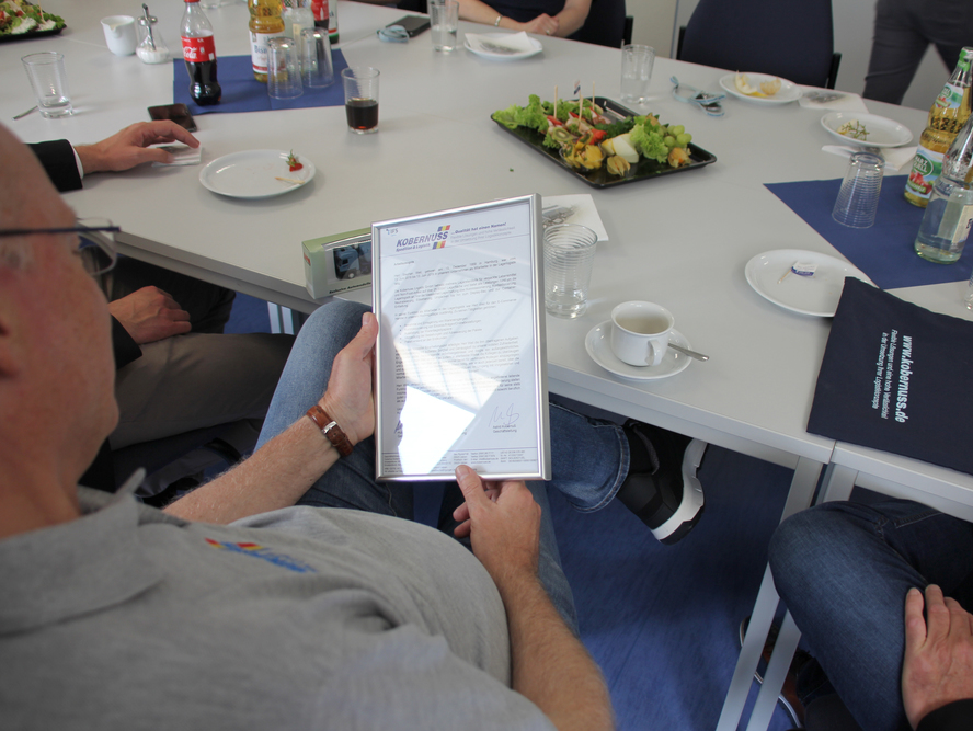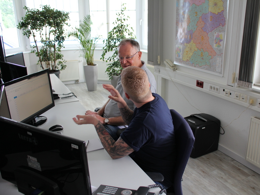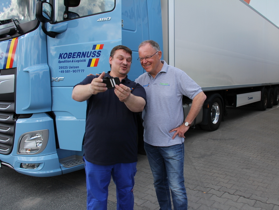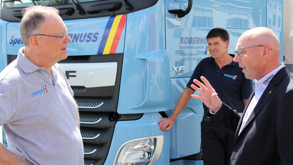 Im Anschluss wechselte der Ministerpräsident zur Spedition Kobernuss, um den Speditionsalltag kennenzulernen. Die Spedition hat über 25.000 Quadratmeter Logistikfläche und rund 60 Fahrzeuge. Heuer arbeitet eng mit der Spedition zusammen, wie Inhaber Hubertus Kobernuß dem Regierungschef erklärte. Im Außenlager von Kobernuss werden die großen Überseecontainer angeliefert, ausgepackt und zwischengelagert. Kundenaufträge werden im Büro von Heuer dann digital an das Außenlager gesandt, sodass die dort tätigen Kobernuss-Mitarbeiterinnen und Mitarbeiter Aufträge gleich bearbeiten und versenden können. Auch die Spedition leidet unter dem Fachkräftemangel. Das Traditionsunternehmen bildet inzwischen Fachkräfte für Lagerlogistik aus. Stephan Weil machte sich selbst ein Bild von der Tätigkeit und packte zusammen mit Lagerarbeiter Andre Ryska beim Lkw-Entladen kräftig mit an. Anschließend ging es ins Büro, wo der Regierungschef erfuhr, wie komplex die Disposition einer Spedition ist und wie wichtig eine gute Straßenanbindung für den Standort in Uelzen ist.