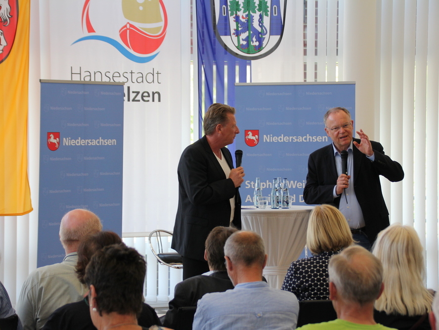 Der Arbeit im Gewerbegebiet Uelzen folgte am Abend der Bürgerdialog im Ratssaal der Stadt Uelzen. Dort erlebten rund 50 Bürgerinnen und Bürger einen aufmerksamen und interessierten Ministerpräsidenten. Ausführlich beantwortete Stephan Weil die Fragen und erläuterte seine Positionen zu bestimmten Themen. Das Spektrum reichte dabei von der geplanten Tank- und Rastanlage an der A39 über den Bau von Windkraftanlagen bis hin zu den Anliegerbeiträgen für den Straßenausbau und fehlenden Nahverkehrsangeboten.