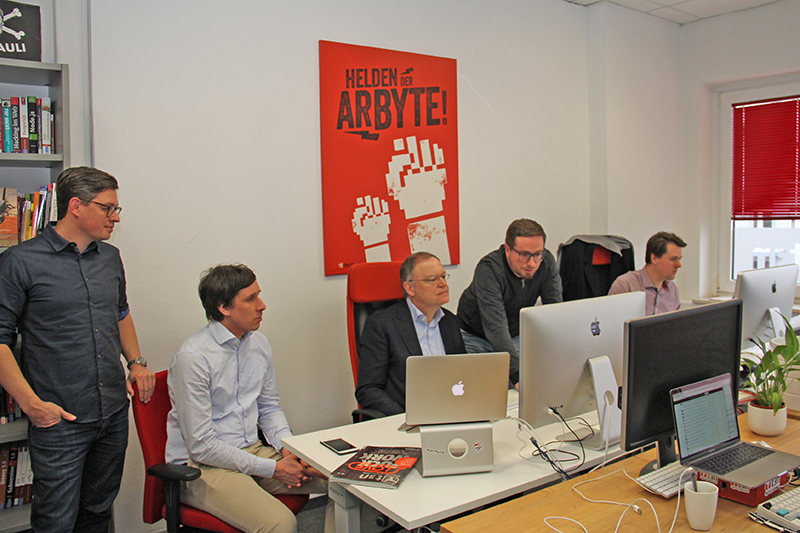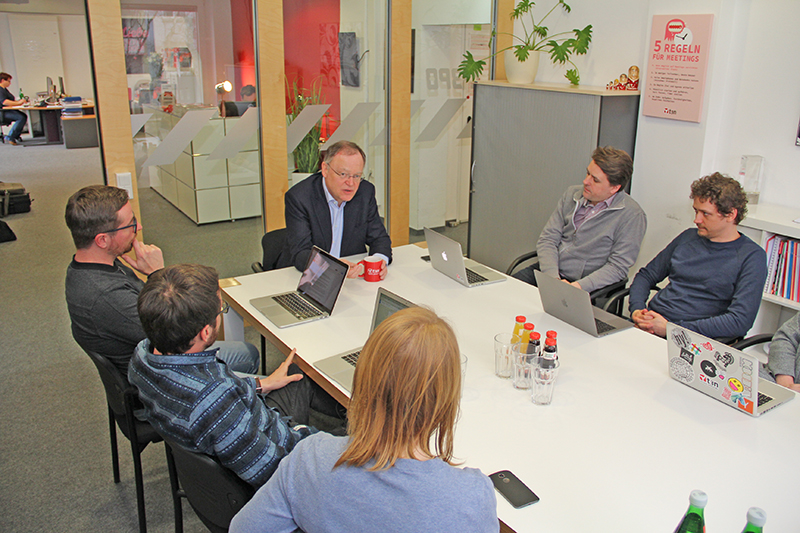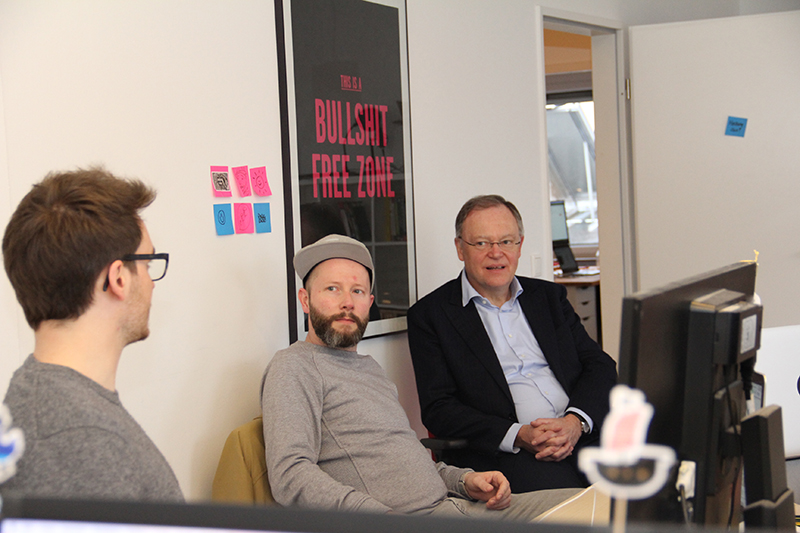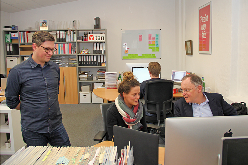 „Ich habe gehört, man duzt sich hier. Also, ich bin Stephan.“ – Gleich zu Beginn seines Besuchs bei t3n machte Ministerpräsident Stephan Weil deutlich, dass er ganz und gar eintauchen will in die neue Arbeitsumgebung. In der Redaktion des Magazins, das über Themen und Trends der Internetbranche berichtet, gehören ein offenes Miteinander und flache Hierarchien zur Firmenphilosophie. Am 8. März mischte sich Weil für einige Stunden unter die Beschäftigten des hannoverschen Medienunternehmens yeebase media, Herausgeber des t3n-Magazins: eine weitere Station in der Reihe „Stephan Weil: Arbeit & Dialog“.