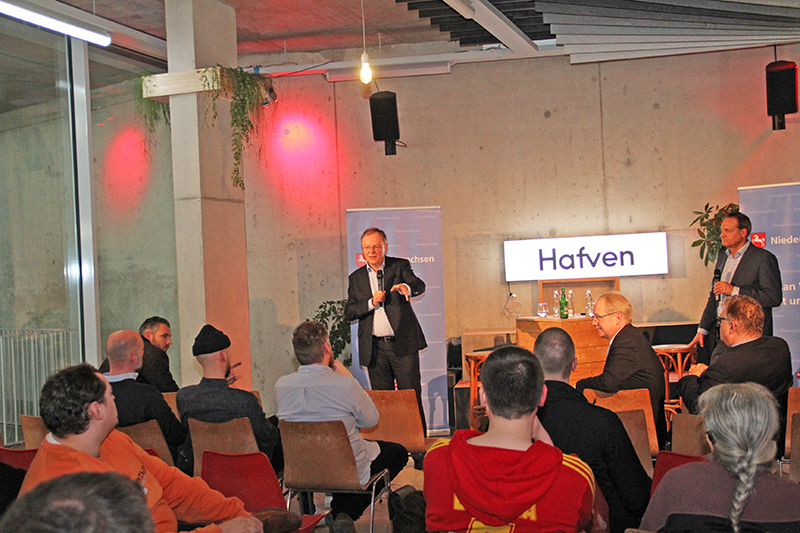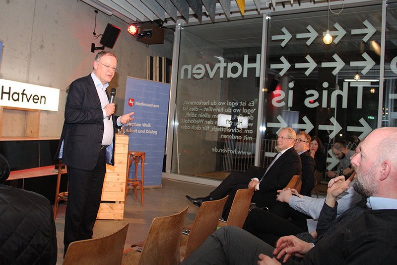Auch am Abend beim Bürgerforum im hippen Kreativzentrum Hafven, Treffpunkt und Ideenschmiede innovativer Start-ups in der Nordstadt, Weil antwortete nach bestem Wissen auf die Fragen der Bürgerinnen und Bürger und nahm diverse Anregungen entgegen. Die Herausforderungen im Bereich der Aus- und Fortbildung für digitales Arbeiten wurden ebenso diskutiert wie neue (digitale) Zusammenarbeitsformen und die Frage, ob geringer Qualifizierte in einer zunehmend digitalisierten und automatisierten Welt noch genügend Arbeitsmöglichkeiten finden.