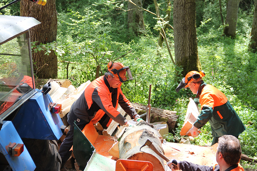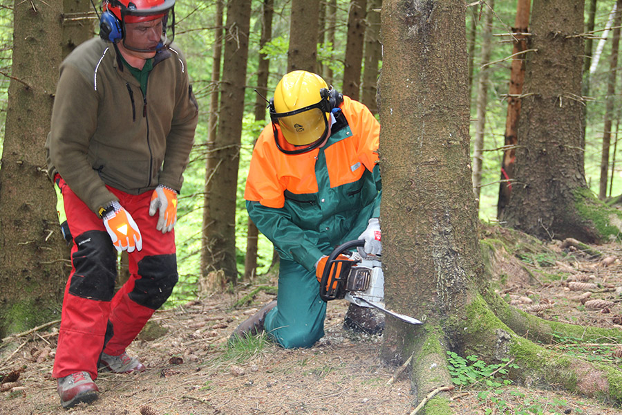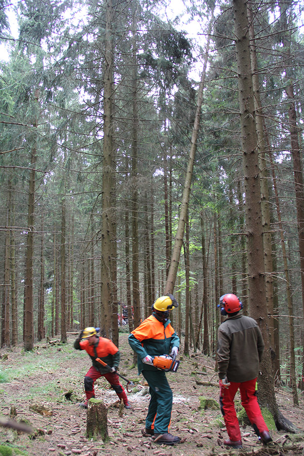 Anschließend durfte Weil eine etwa 25 Meter hohe und 30 Zentimeter starke Fichte mit der Motorsäge fällen. Dabei musste er zunächst einen Fallkerb in den Baum sägen, um damit die Fällrichtung festzulegen. An der gegenüberliegenden Seite des Baumes setzte er die Säge zum Fällschnitt an und sägte den Baum bis auf eine Bruchleiste durch. Grundsätzlich wird ein Baum dann nicht umgesägt, sondern, falls er nicht von selbst fällt, umgekeilt.