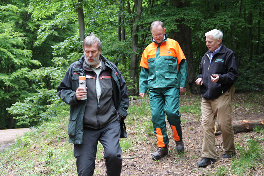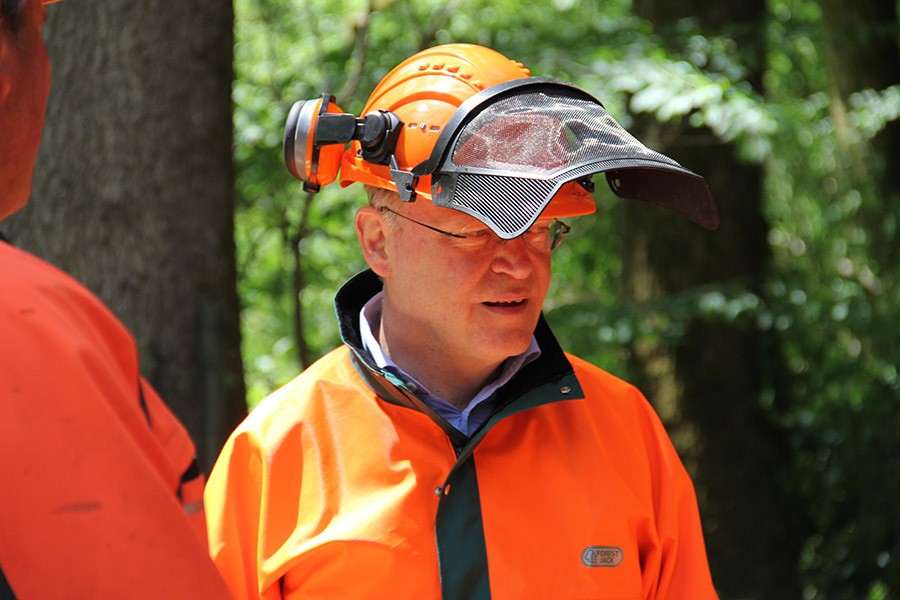 Raus aus dem Anzug, rein in die grün-orange Schutzkleidung, Helm sitzt und auf in den Wald: Ministerpräsident Stephan Weil hat am 21. Mai 2015 einen Nachmittag als Waldarbeiter im Herzberger Grafenforst am Harz geackert. Während dieser Station in der Reihe „Stephan Weil: Arbeit und Dialog“ lernte Weil viele Handgriffe der Waldarbeiter kennen – oft mit Unterstützung von Maschinen. Zunächst musste er am so genannten Holzspalter rund einen Meter lange Scheitholze auf so genannte Meterbänke aufsetzen. Danach brach Weil mit dem Team zu einer Waldtour in der Nähe der Herzberger Hütte auf. Die Experten erläuterten, wie Bäume ausgewählt und ausgezeichnet werden, die entweder gefällt werden oder als Zukunftsbäume stehen bleiben sollen.
