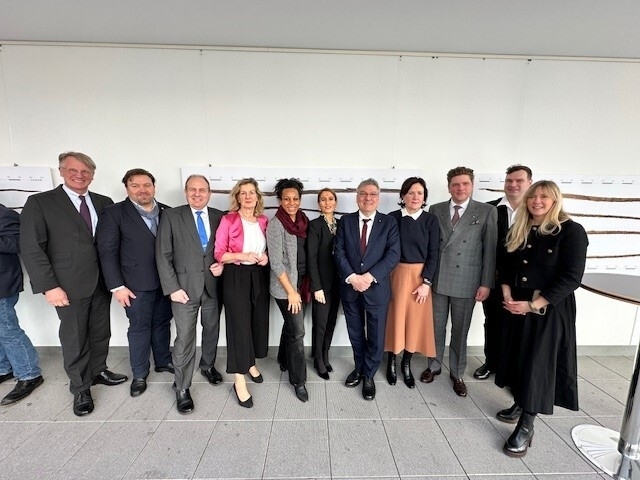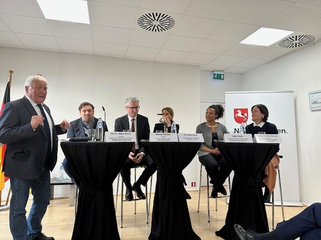 Im Anschluss an die Besichtigung der Ausstellung in der Landesvertretung, diskutierten Vertreterinnen und Vertreter aus europäischen Institutionen sowie aus Wissenschaft und Denkmalpflege die Rolle der Fundstätte im Kontext aktueller kultur- und wissenschaftspolitischer Entwicklungen.