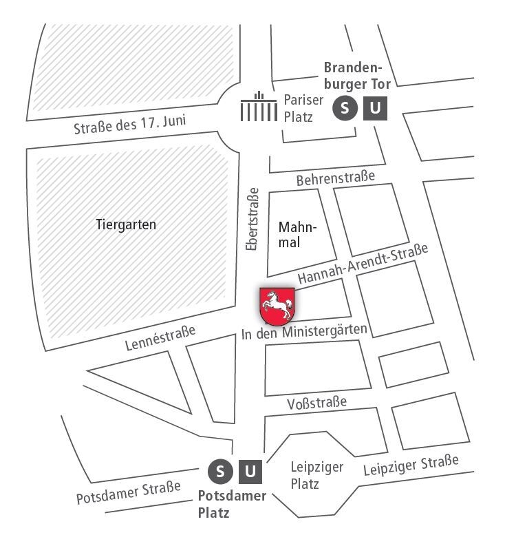 mit der Linie U2 bis „Potsdamer Platz“ oder „Mohrenstraße“, oder mit der Linie U55 bis „Brandenburger Tor“.