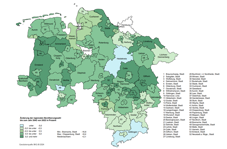 Die dargestellte Karte zeigt die regionale Bevölkerungsveränderung bis zum Jahr 2042 in Prozent von der Bevölkerungszahl des Jahres 2022. Die Bevölkerungszahlen in vielen der betrachteten Verwaltungseinheiten (69 von 89) werden bis zum Jahr 2042 weiter zunehmen. Insbesondere Gebiete im westlichen Niedersachsen, Verwaltungseinheiten nahe an den Stadtstaaten Hamburg und Bremen, sowie die Landeshauptstadt Hannover und deren Umland verzeichnen prozentual starke Bevölkerungsgewinne. Den stärksten prozentualen Anstieg der Bevölkerung verzeichnet die Stadt Cloppenburg (8,4 %), wohingegen die Bevölkerung in der Stadt Bramsche am deutlichsten zurückgeht (-16,8 %).