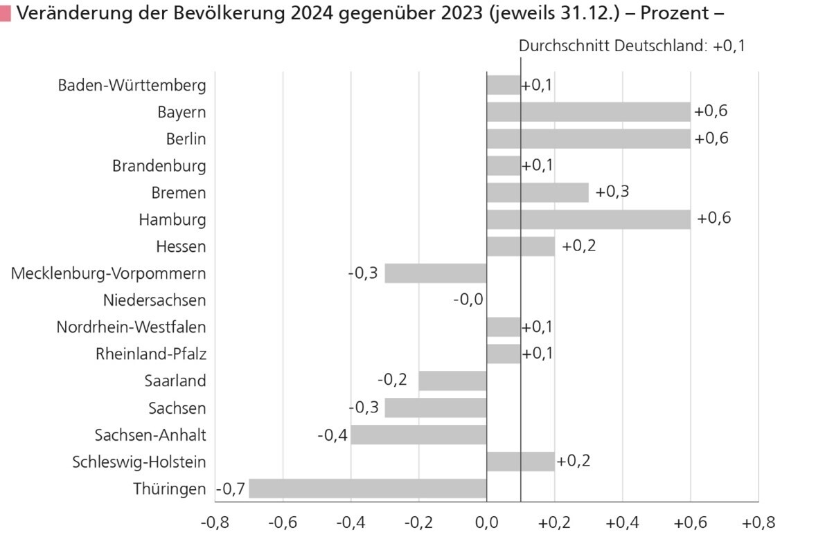 Die größten Bevölkerungszuwächse verzeichneten Bayern, Berlin und Hamburg mit jeweils +0,6 %. Verluste gab es neben Niedersachsen in fünf weiteren Ländern – am stärksten in Thüringen (-0,7 %), Sachsen-Anhalt (-0,4 %) und Sachsen (-0,3 %).