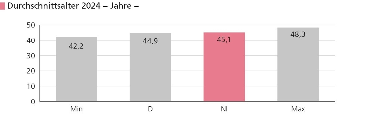 Das Durchschnittsalter betrug 2024: 45,1 Jahre. Die Niedersachsen waren dabei im Schnitt etwas älter als die Bevölkerung im restlichen Bundesgebiet (44,9 Jahre).