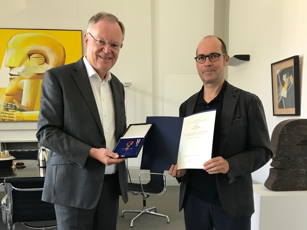 Stephan Weil überreicht den Verdienstorden an Ingo Siegner (im Büro des Ministerpräsidenten)